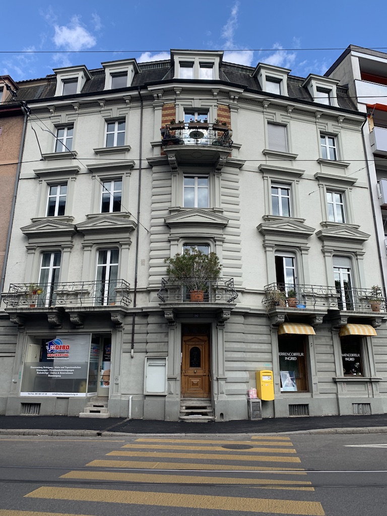 I turn around as I can feel the sun on my back. I photograph the grey traditional building across the street. It is quite decorative. It is framed by cars. It is not possible to capture it without the vehicles that are parked in the street. The light glints off the building and leaves lines in the street.